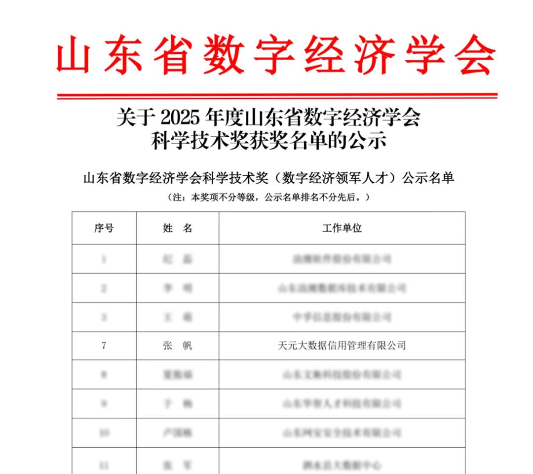 日前,山东省数字经济学会正式公示2025年度科学技术奖获奖名单。作为浪潮卓数大数据、北方健康与天元征信的董事长,张帆入选“数字经济领军人才”。