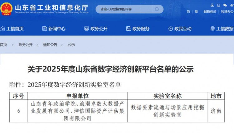 近日,山东省工业和信息化厅公布2025年度山东省数字经济创新平台名单,浪潮卓数大数据联合山东青年政治学院等申报的“数据要素流通与场景应用挖掘创新实验室”成功入选2025年度山东省数字经济创新实验室名单。
