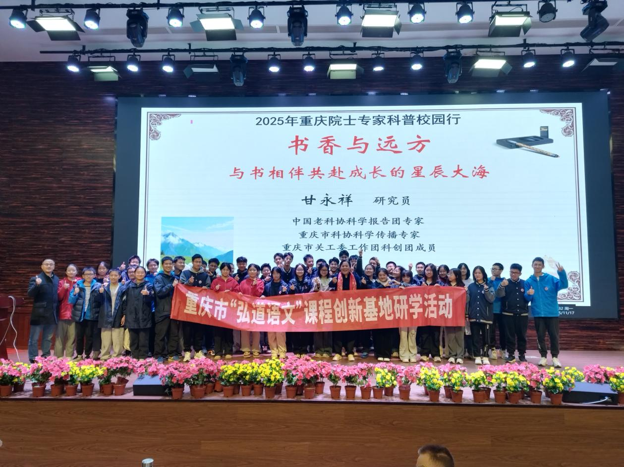 11月17日下午,由潼南区科协、区教委、区老科协联合主办,潼南中学“重庆市‘弘道语文’课程创新基地”承办的“院士专家进校园”科普活动,在潼南中学鉴知楼大礼堂圆满举行。重庆市老科协常务副会长甘永祥教授以“书香与远方”为题,为500余名师生带来了一场兼具思想深度与人文温度的科普讲座,为提升青少年阅读素养、促进身心健康发展注入强劲动力。本次活动由潼南中学“重庆市‘弘道语文’课程创新基地”主持人何春强主持。