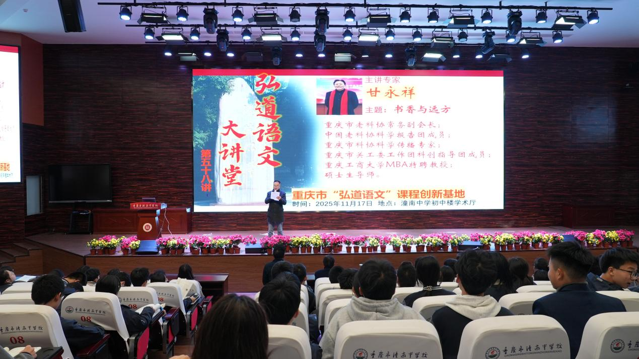 潼南中学重庆市“弘道语文”课程创新基地打造的“弘道语文大讲堂”,自开办以来已成功举办了58场专题讲座,为潼中师生和区域教师带来了一场场兼具思想深度与实践价值的知识盛宴——从文学经典的深度解读到科学思维的启蒙引导,从教学方法的创新分享到成长智慧的真诚传递,每一场讲座都如同一束光,既助力广大师生拓宽认知边界、涵养人文素养,也为区域语文教育创新与教师专业成长注入源源不断的活力。