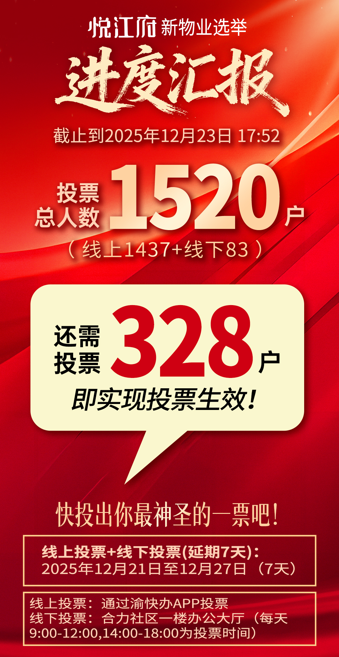 经过一周的投票,悦江府的业主代表志愿者天天拉票打电话通知,能用的方式都用到了,截至2025年12月23日总算是投到了1520票,其中线上投票1437户,线下投票83户。投票人数已经完成了超小区总人数2/3的目标。已经算是在一个入住率不足40%的小区的一个奇迹了,甚至还有在越南海外的业主也通过线上进行投票。