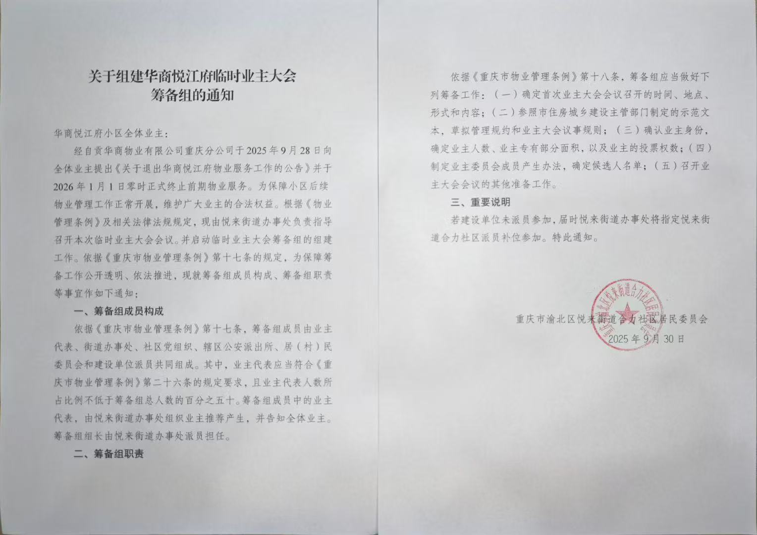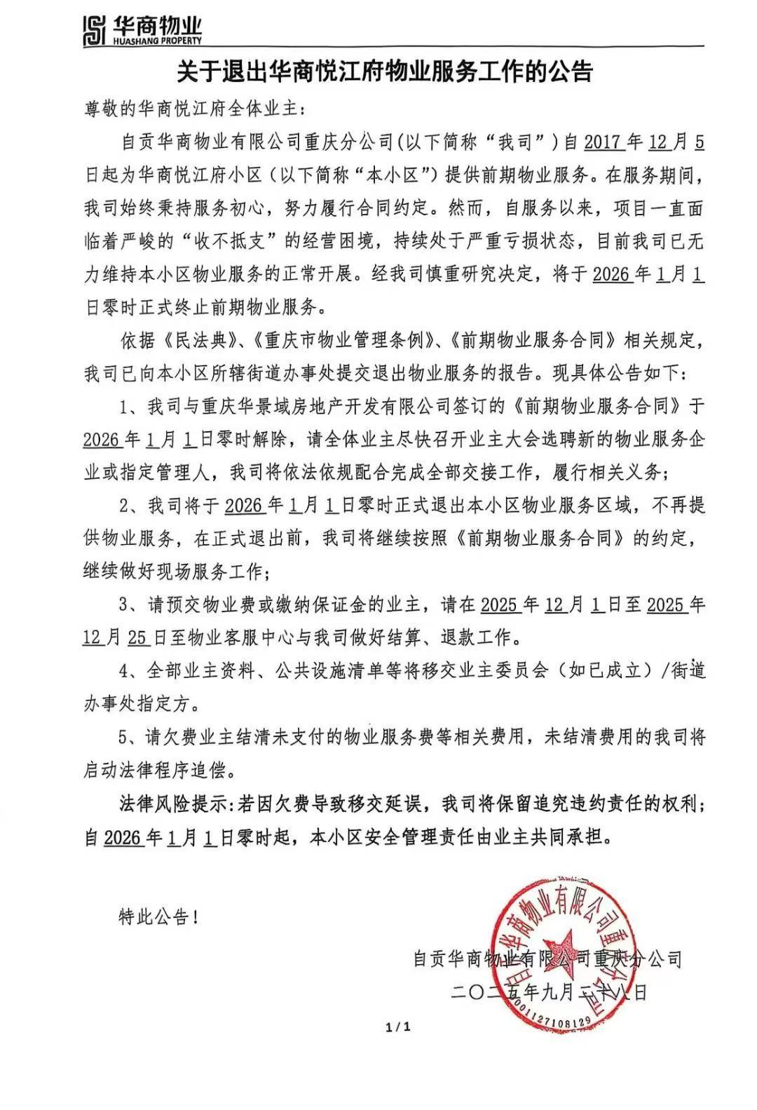 华商物业在2025年12月31日即将退场,小区即将面临无物业状态,情况非常紧急!希望,这一次,悦江府的所有业主,能一起齐心协力,度过这个难关!