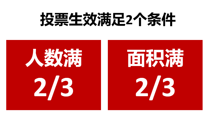 为什么面积达不到呢?原因就是,目前的开发商手里还持有大量的面积的产权,比如车库商铺以及一些其他相关的设施面积,只要开发商来投票,那么他的基数就进入分子分母,就能轻松满足面积超2/3的条件。