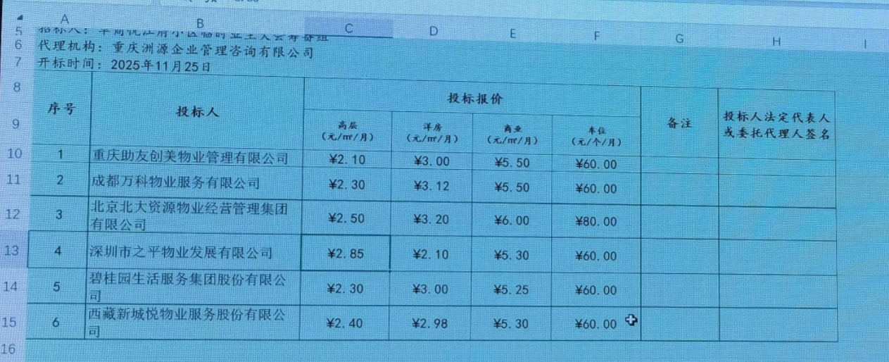 接下来,由悦来合力社区街道指派了一家第3方的招投标公司进行招标征集,然后吸引了几家物业公司来投标,经过公示后,然后开标,通过邀请专家评选啥的,然后最终选出来2家物业公司,分别是重庆助友创美物业管理有限公司和成都万科物业服务有限公司。