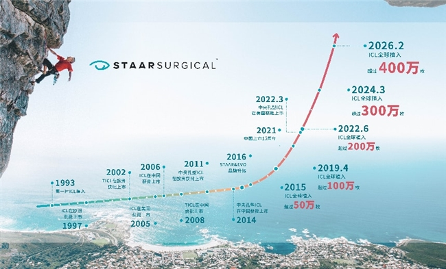 2026年2月,全球屈光手术领域迎来一座新的里程碑,STAAR Surgical公司宣布,EVO ICL晶体全球累计植入量突破400万枚!从1993年首例手术成功,到2019年突破100万、2022年达200万、2024年超300万,再到今天迈入400万大关,这一跨越式的增长轨迹,见证了ICL技术三十余年的稳健发展,每一枚ICL晶体的植入,背后都是一次严谨的临床验证。400万这一数字,不仅是市场认可度的直观体现,更是安全性与有效性的有力背书。