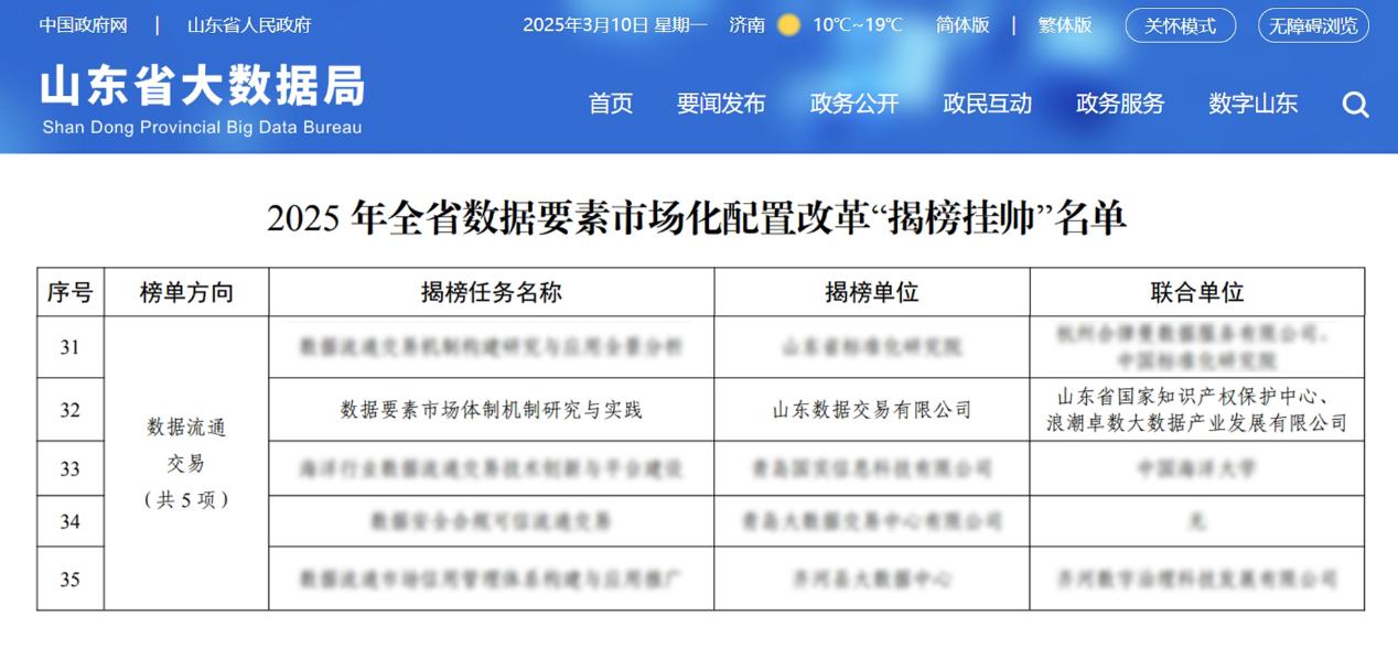 近日,山东省大数据局公布2025年全省数据要素市场化配置改革“揭榜挂帅”名单,由浪潮卓数大数据联合山东数据交易有限公司、山东省国家知识产权保护中心申报的“数据要素市场体制机制研究与实践”项目成功入选“数据流通交易”榜单。