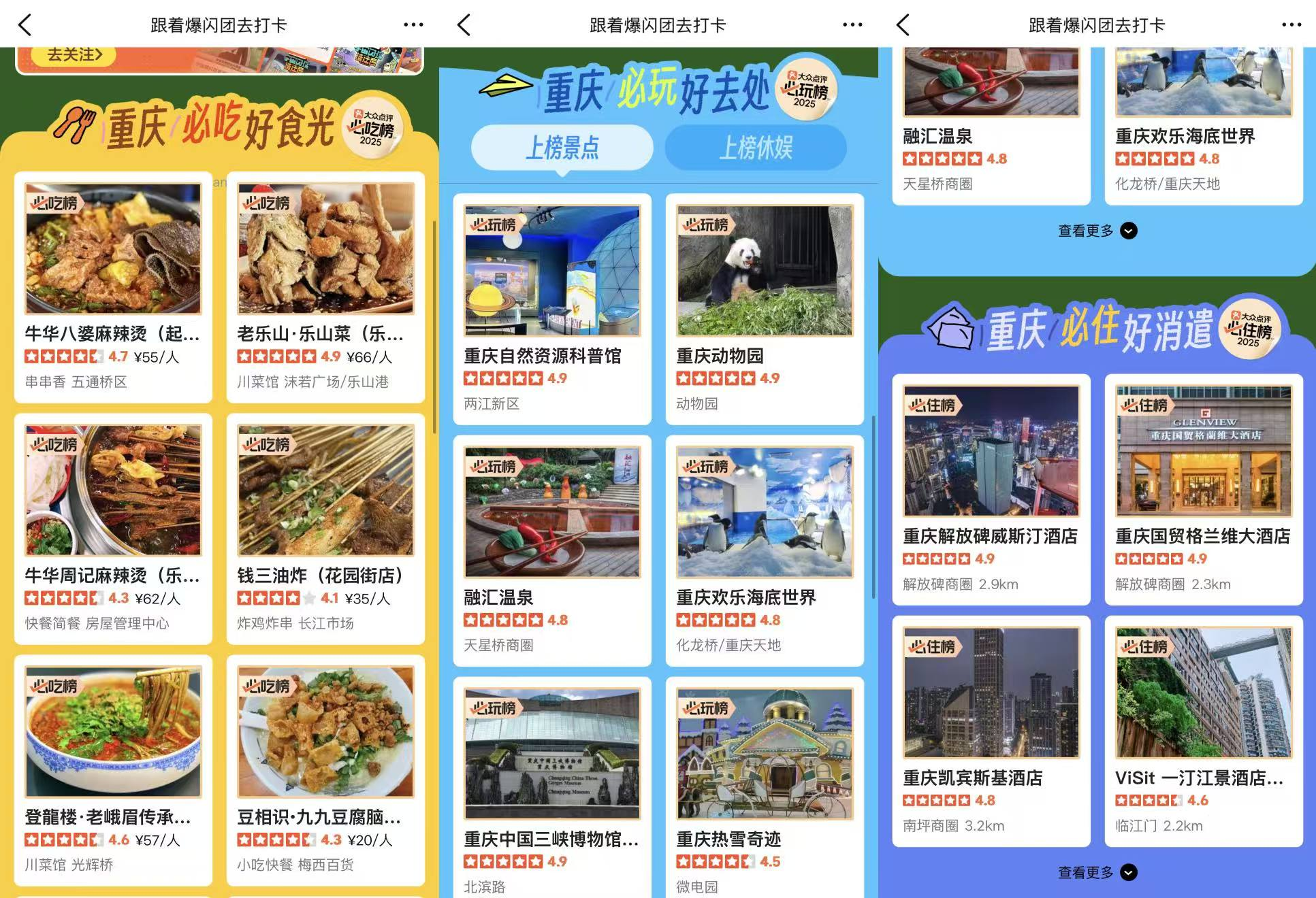 为让节目中的体验落地现实,节目独家冠名商大众点评同步上线“跟着爆闪团去打卡”专题页面,精准标注重庆南岸的核心打卡点位,推出专属的必吃、必玩、必住榜,让游客实现“看综艺-找攻略-去消费”的一键直达。节目播出后,大众点评重庆“必吃榜”“必玩榜”整体流量显著攀升,其中“必玩榜”周增幅接近50%,铜元酒馆单日粉丝到店量超50桌,成为名副其实的网红打卡地。