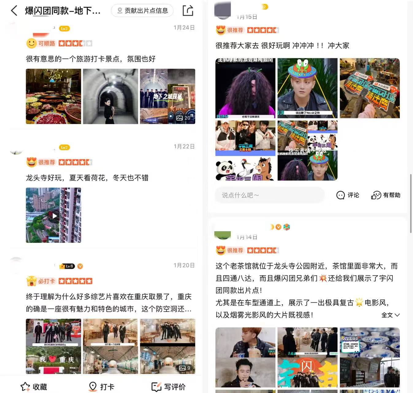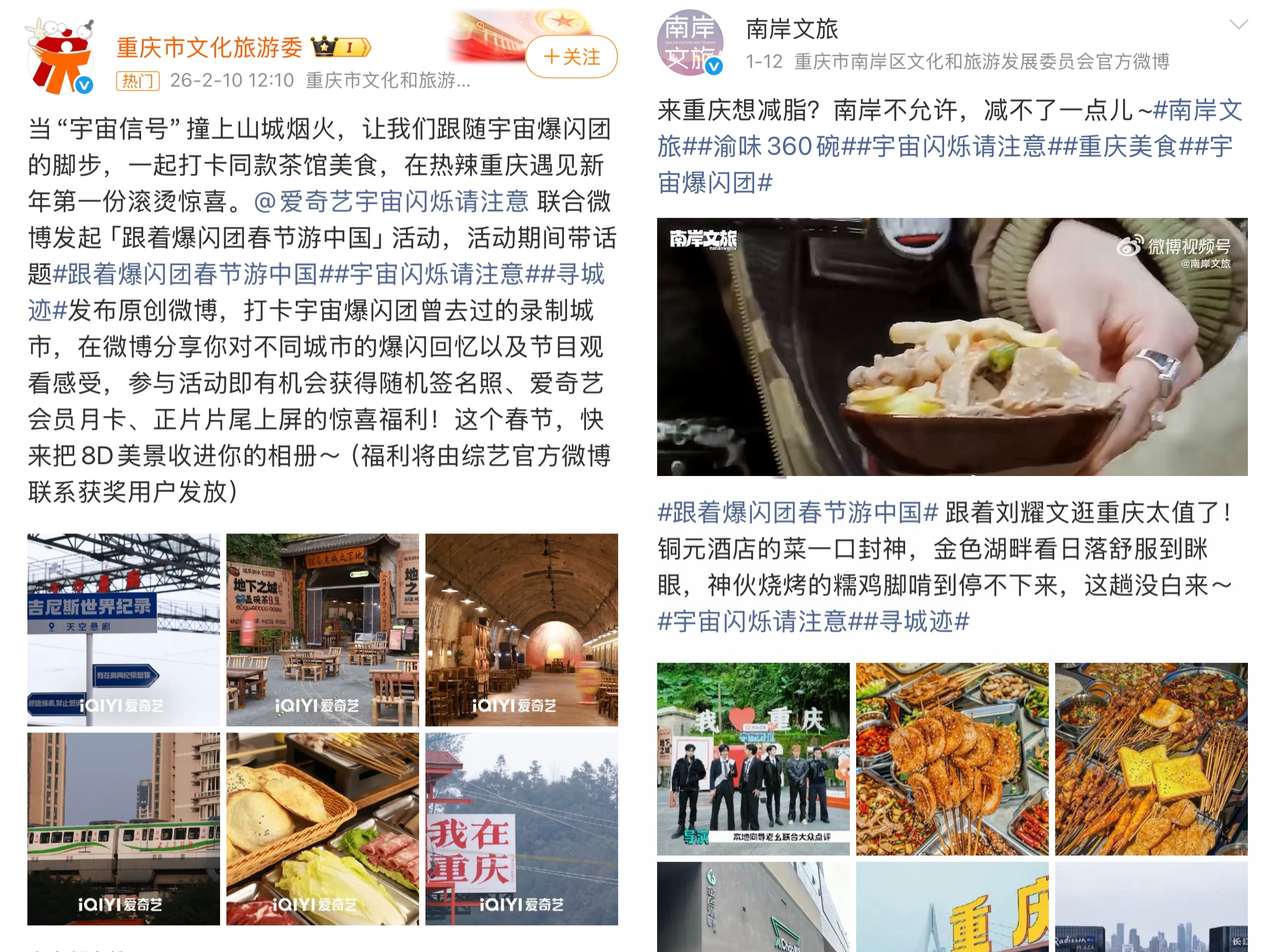 重庆市文化旅游委第一时间推广此次#跟着爆闪团春节游中国#活动,邀请游客分享山城打卡回忆,推动话题持续发酵,主话题微博浏览量已突破870万;南岸文旅更是以“南岸不允许减脂”的趣味话题,联动节目素材推广本地美食,精准触达年轻群体。游客们在社交平台纷纷分享打卡体验,“跟着刘耀文、王鹤棣逛重庆”成为热门话题,铜元酒馆的江湖菜、地下之城茶馆的出片场景,都成为网友口中“山城的正确打开方式”。