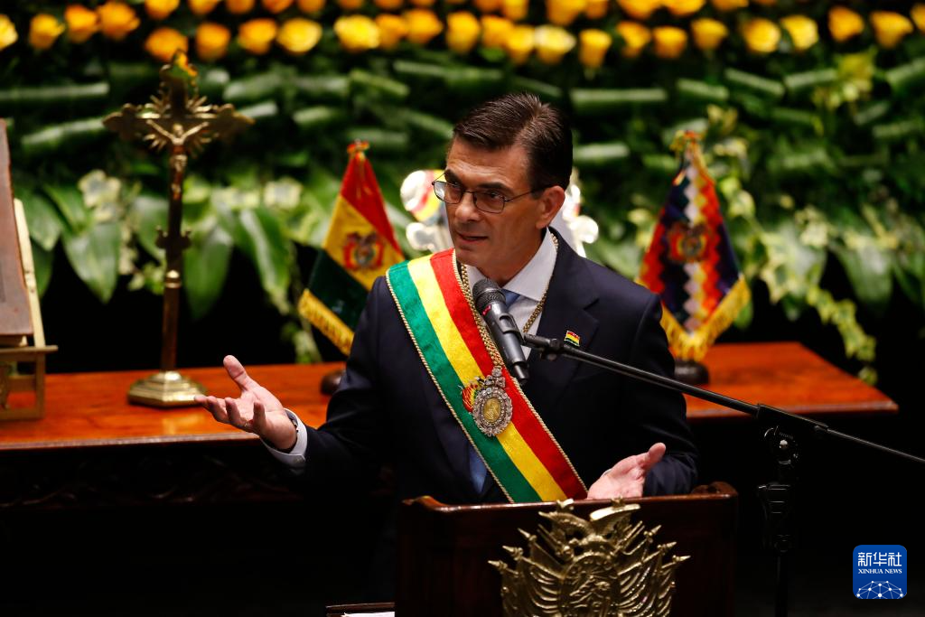 11月8日,在玻利维亚拉巴斯,帕斯在就职仪式上致辞。 新华社发(路易斯·甘达里利亚斯摄)